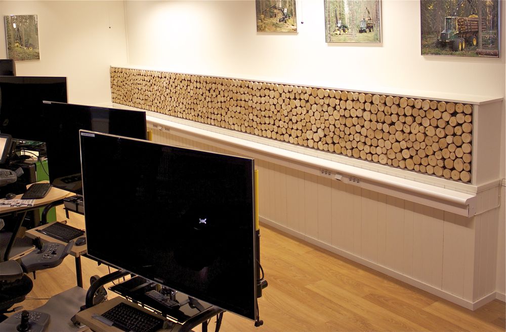 Vänner! Älvdalens utbildningscenter har ett simulatorrum där eleverna lär sig köra skördare och skotare. Klassrummet ramades in med hjälp av en 6 meter lång WoodWall
